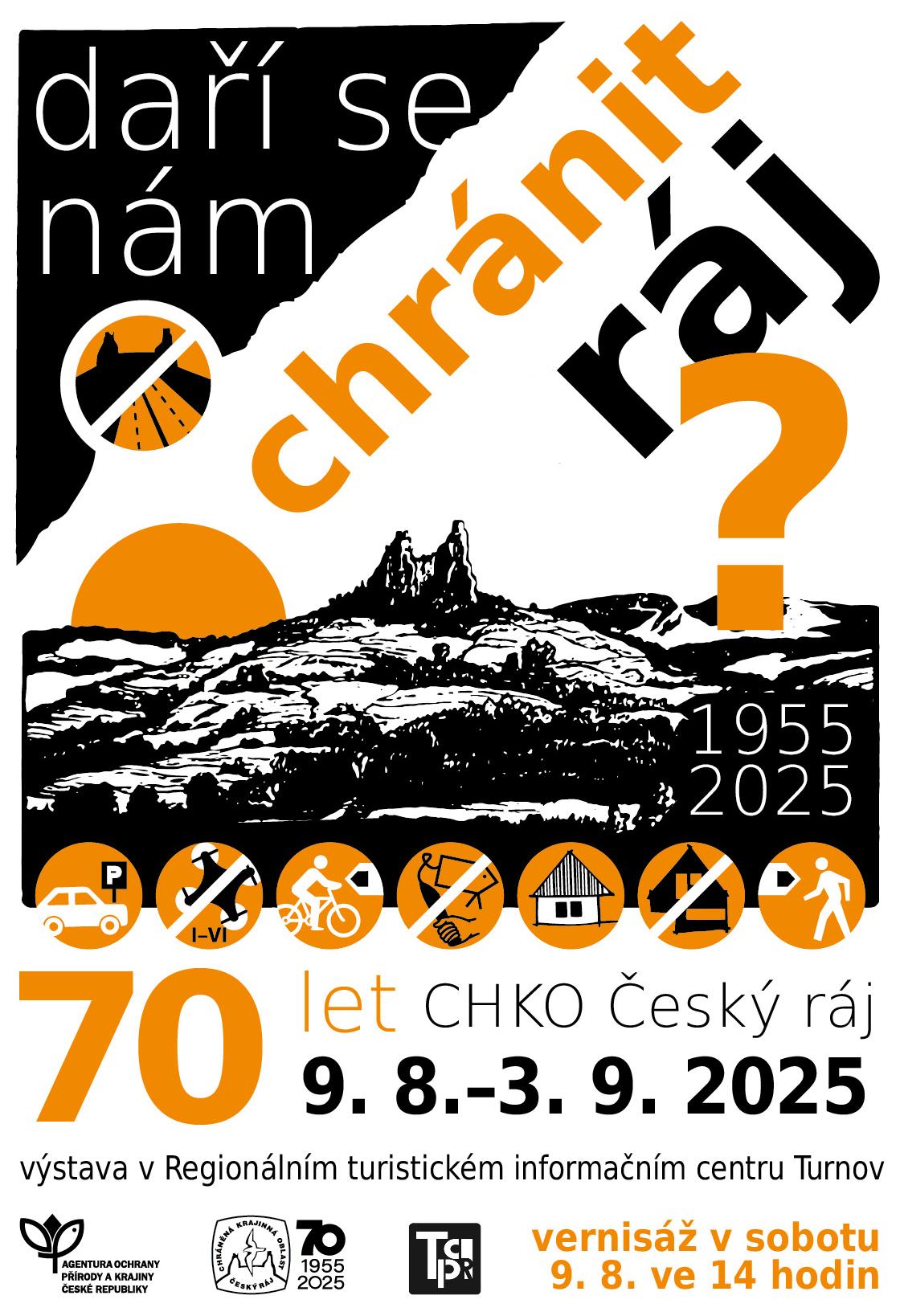 DAŘÍ SE NÁM CHRÁNIT RÁJ? K sedmdesátinám CHKO Český ráj jsme připravili výstavu. Představuje práci v ochraně přírody a krajiny Českého ráje v uplynulých desetiletích. Přijďte se podívat. Výstavu lze shlédnout od 13. 6. do 27. 7. 2025 na Valdické bráně v Jičíně, od 9. 8. do 3. 9. v Regionálním turistickém informačním centru v Turnově, od 12. 9. do 5. 10. na zámku v Mnichově Hradišti a v říjnu v Sobotce. |
